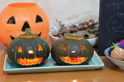 田舎のばあちゃんから思いがけなく野菜が届いて、ハロウィンのかぼちゃおばけを作ることができました。わぁい。中身をくり抜いたとき出てきた虫が怖かったけどがんばった。 今月中頃から部屋に色紙でハロウィンの飾り付けをしてあるからもうさなも知っていて…