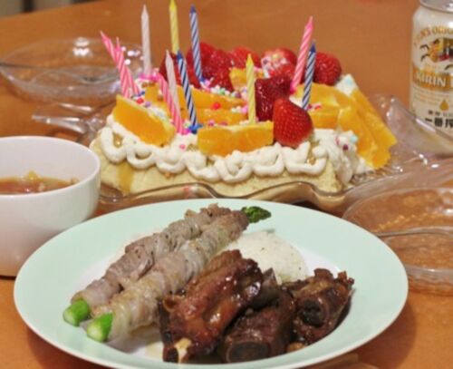 今日は土曜日。17日に誕生日だったパパの誕生会をした。 夕食のメニューは、炊飯器で炊くガーリックライス、しめじと千切り人参のソテー、醤油味のスペアリブと、ワインとシーズニングソルトに漬けた豚バラ肉巻きアスパラ。 ケーキは、スフレチーズケーキに…
